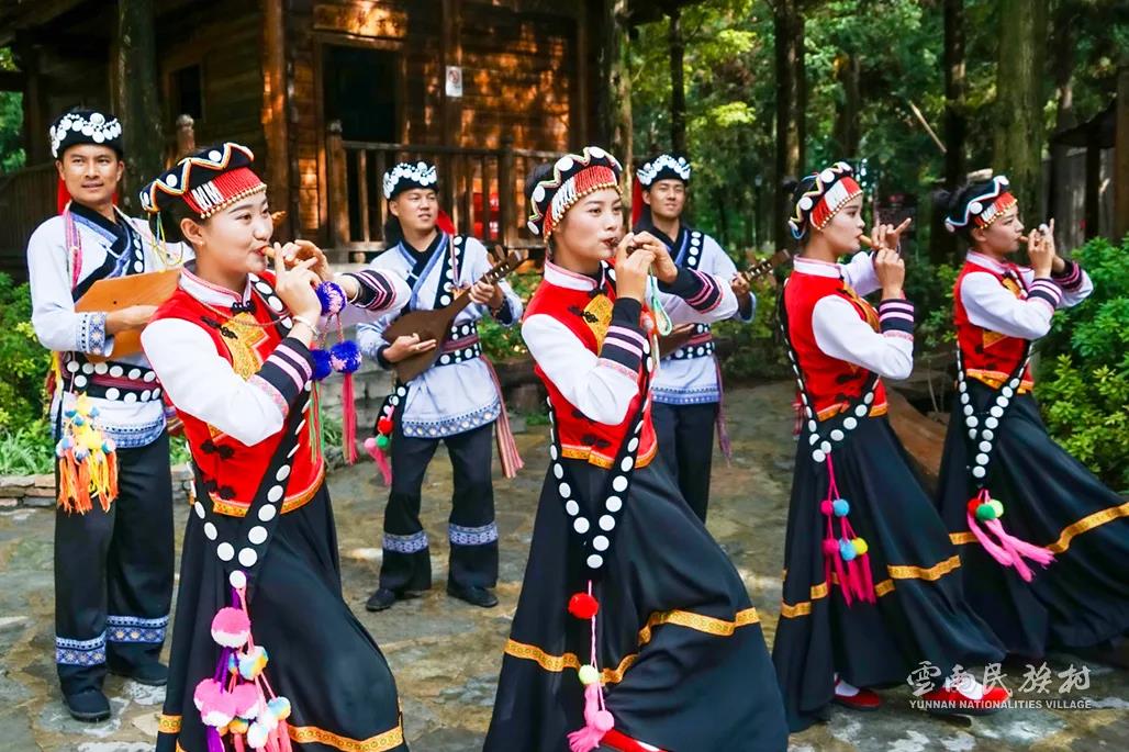 彝族在云南境內(nèi)約471萬人,是省內(nèi)人口最多、分布最廣的少數(shù)民族,主要聚居在金沙江、元江流域和哀牢山、無量山腹地。彝族是一個能歌善舞的民族,民間打歌、跳樂之風(fēng)盛行,大三弦、跌腳舞久負盛名。火把節(jié)是彝族最具特色的民族節(jié)日。彝族村占地50余畝,三虎浮雕墻與虎頭內(nèi)祖師形象表現(xiàn)了彝族虎鷹文化。太陽歷廣場圖騰柱上有太陽、虎、火和八卦圖形象,周圍環(huán)繞著10個朝向不同的月球造型,外圓周有12生肖石雕。依山而建的“...
